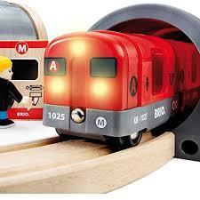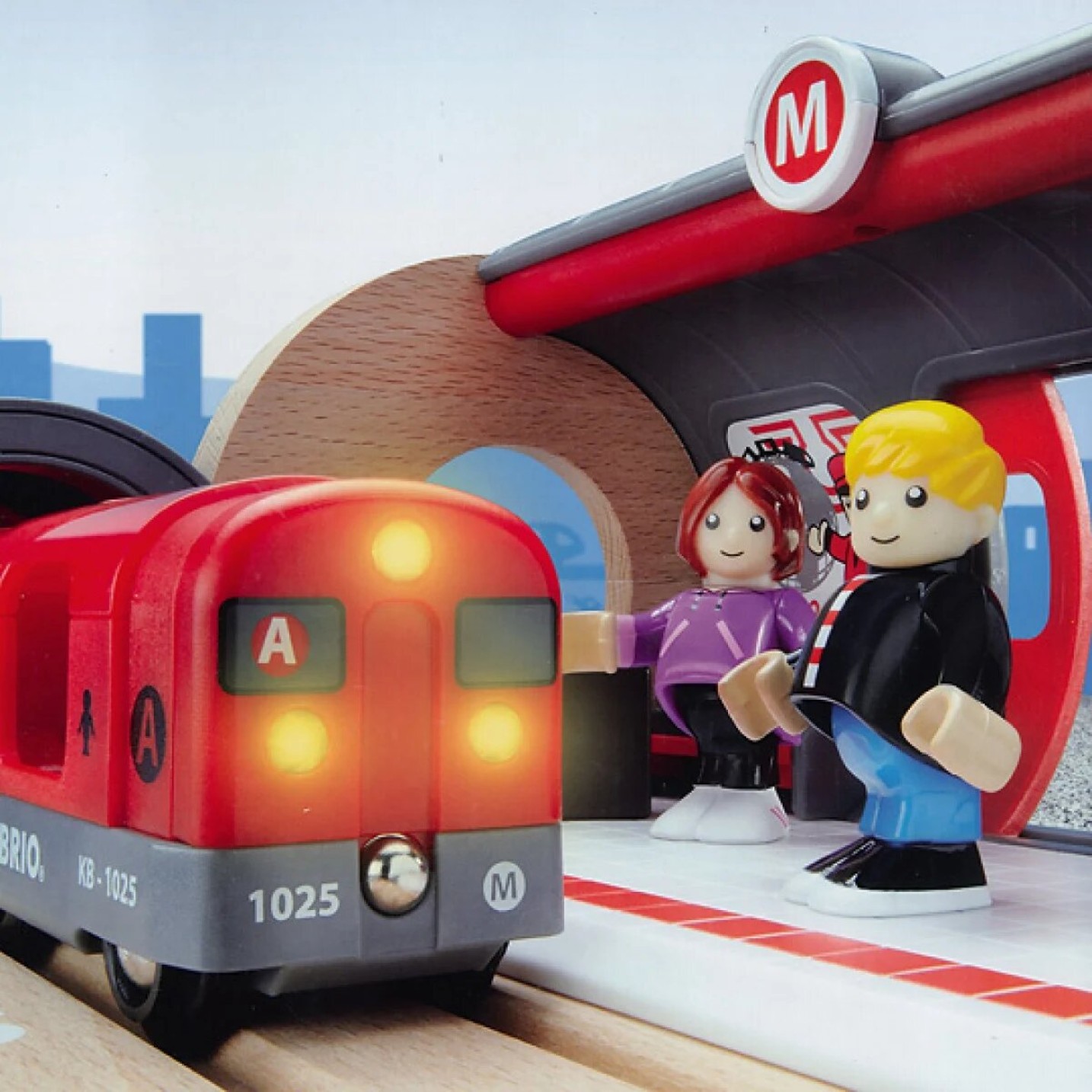 ¡Coge el metro para ir a la ciudad! El tren se adapta a la conducción: a mayor velocidad, más intensos serán la luz y el sonido. Este conjunto de vías férreas para metro urbano conduce a los niños a un mundo que les recordará la realidad. La estación de metro está compuesta por detalles como puertas correderas, asientos de andén y pasajeros. Se puede conectar a todos los trenes BRIO y el sistema de redes ferroviarias de madera BRIO.